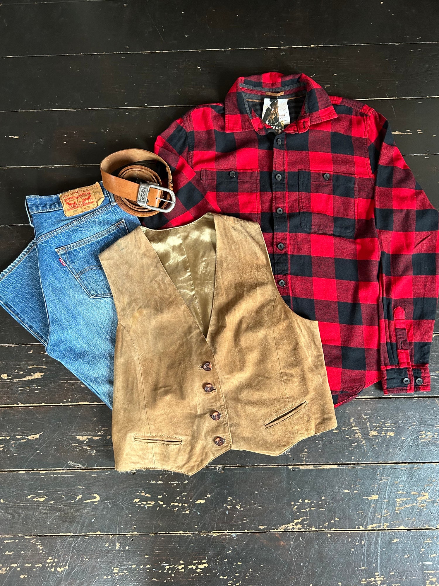 Our suede waistcoats collection offers timeless vintage layering with boho and western-inspired designs. These pieces are carefully sourced for their individuality, character and versatile styling potential. From retro festival-ready fringe waistcoats to classic suede tailoring, every item is unique and sustainably chosen. Pair them with Vintage Shirts for a smart-casual look or layer over T-Shirts & Tops for effortless styling. Each suede waistcoat is a distinctive piece that adds texture, depth and retro charm to your wardrobe while supporting sustainable fashion.
