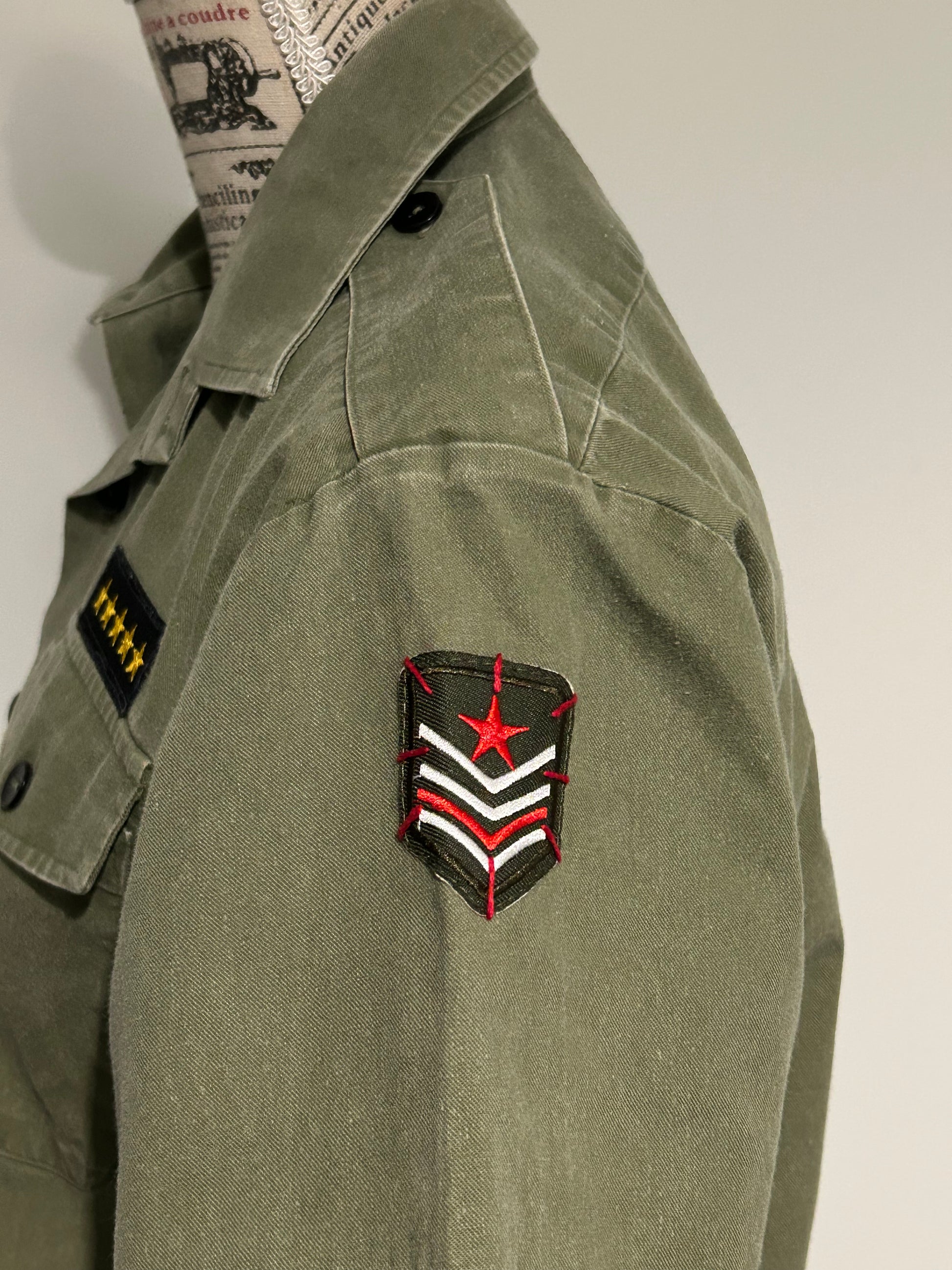 Elevate your wardrobe with our Reworked Army Shirt, a perfect blend of classic charm with hand sewn vintage patches and chain of flowers trim embellishment with gunmetal diamante star on the back.