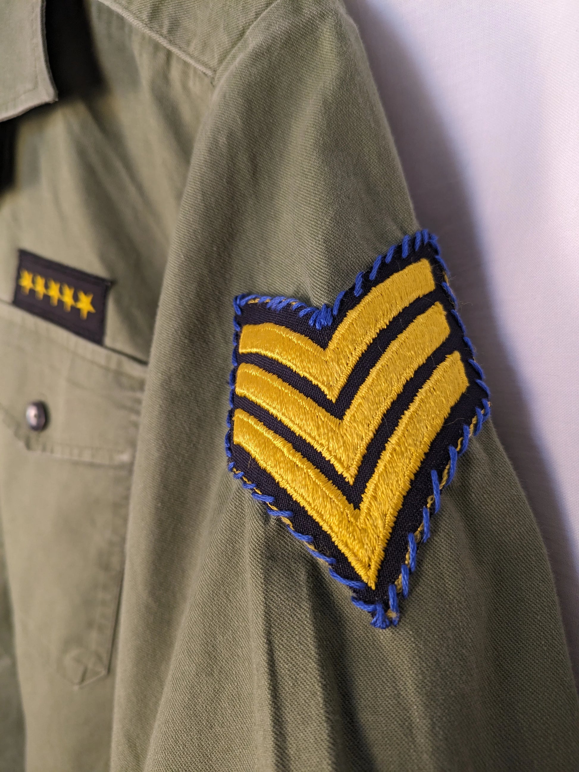 Elevate your wardrobe with our Reworked Army Shirt, a perfect blend of classic charm with hand sewn vintage patches and gold stripe trim embellishment. This shirt has been reworked to bring you a unique piece that's both stylish and sustainable.