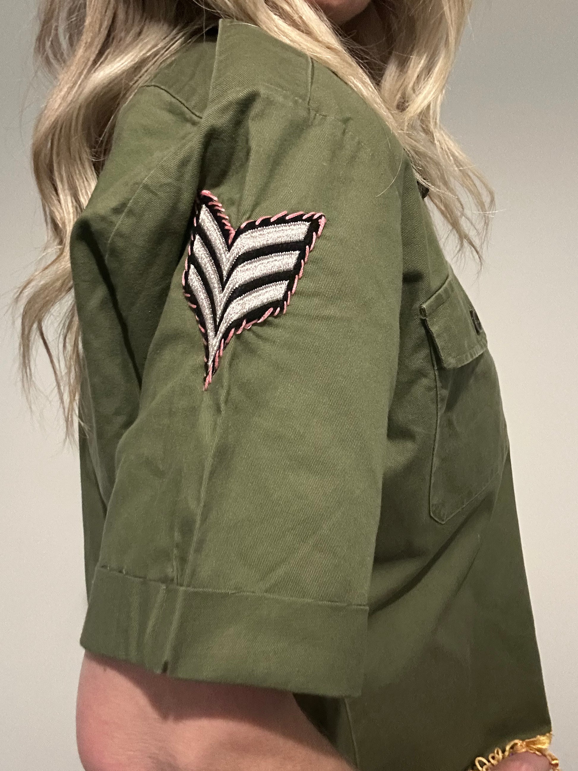 Elevate your wardrobe with our Reworked Army Shirt, a perfect blend of classic charm with hand sewn vintage patches and tassel fringing with gunmetal diamante star on the back.