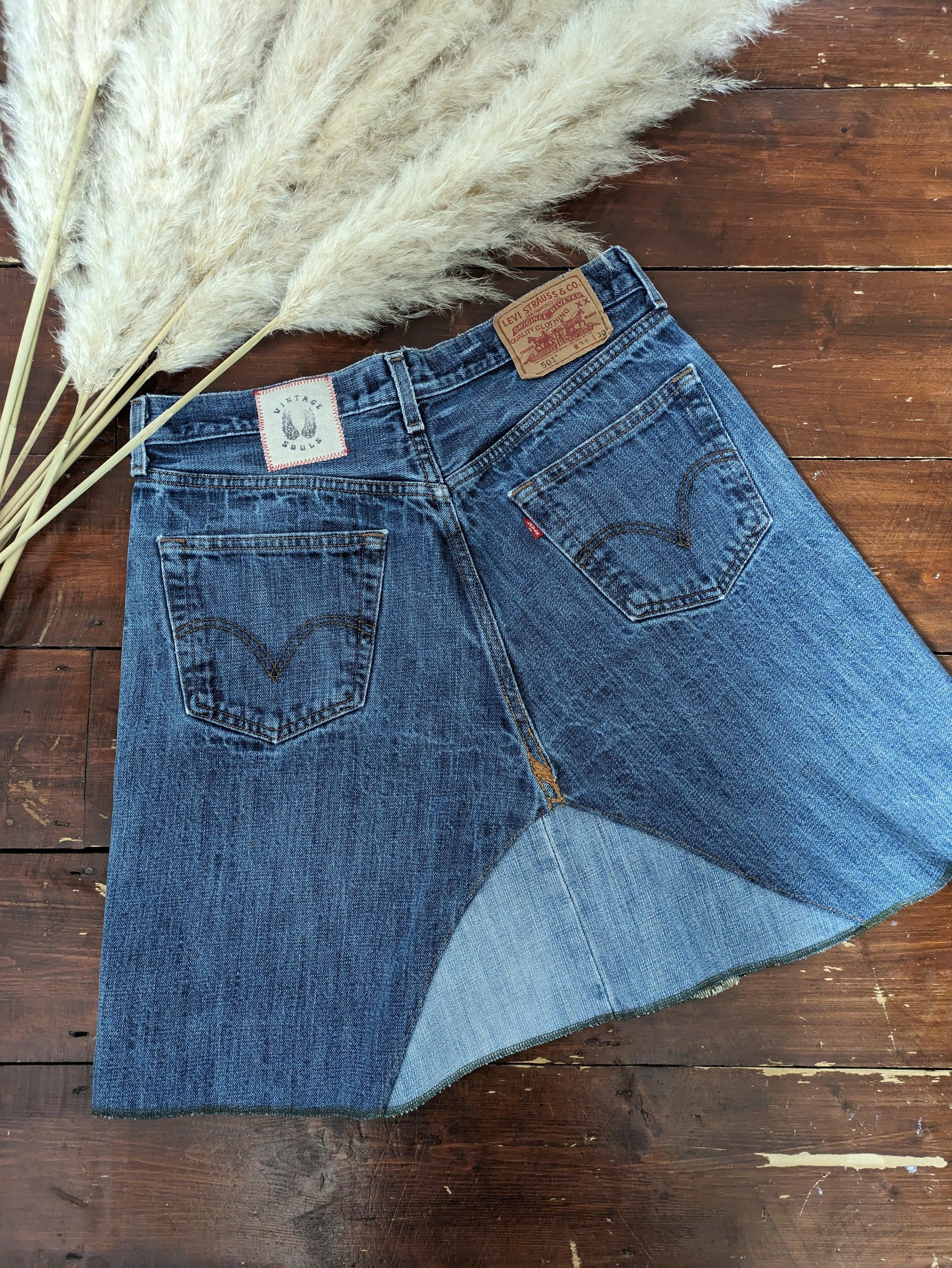 Elevate your wardrobe with our Reworked Vintage Denim Jeans Skirt, a perfect blend of classic charm and contemporary flair. Crafted from Vintage Levi's 501's denim with front and back panels to give that extra flared look. This denim skirt has been reworked to bring you a unique piece that's both stylish and sustainable.